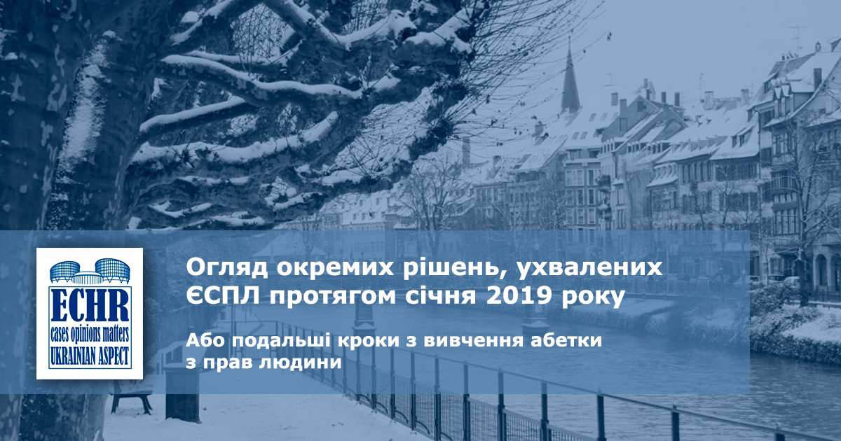 Аналітичний огляд окремих рішень, ухвалених ЄСПЛ протягом січня 2019 року ECHR: Ukrainian Aspect автор 14 Березня 2019 | 335 | Підпишись прямо зараз! Заповни форму, щоб отримувати новини на пошту