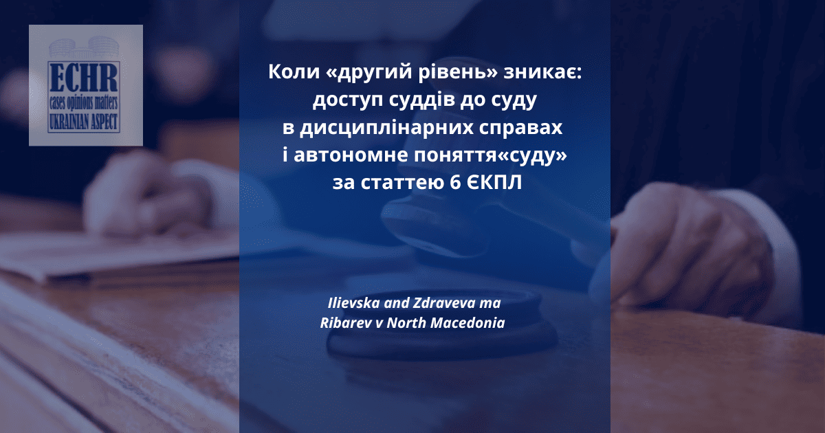 Новини Статті Завантаження... Коли «другий рівень» зникає: доступ суддів до суду в дисциплінарних справах і автономне поняття «суду» за статтею 6 ЄКПЛ (за рішеннями ЄСПЛ Ilievska and Zdraveva та Ribarev v North Macedonia) Автор: ECHR: Ukrainian Aspect 340