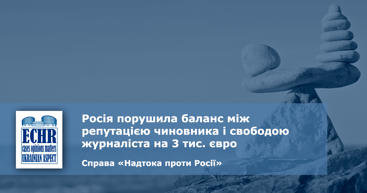 рішення ЄСПЛ у справі «Надтока проти Росії» № 2 (№ 29097/08) ECHR: Ukrainian Aspect автор 11 Листопада 2019 | 433 | Підпишись прямо зараз! Заповни форму, щоб отримувати новини на пошту